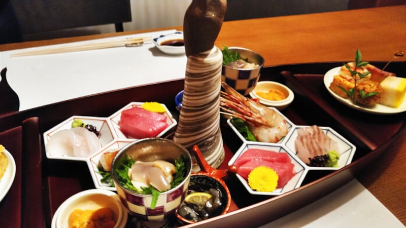 そんな地元食材をふんだんに取り入れた会席料理は、まず海の幸からスタート。ウニにイクラにボタンエビ、さらにはホッキ貝やマグロなどなど、きら星のごとき海鮮グルメがアイヌ民族交易船を思わせる舟形器に満載された「宝楽盛り」がテーブル上に出現し、一気に食欲は舞い上がります。