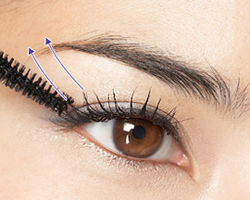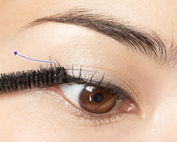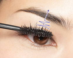 セパレート効果のあるマスカラのコーム部分を上まつ毛の根元にしっかり当てて、2~3秒間止めてマスカラ液をのせる。それから左右に小刻みに揺らしながら、とかし上げる。