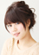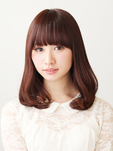 毛先を平巻きでワンカール巻いて、鎖骨あたりで揺れるような動きをつけます。ヘアアイロンは、毛先全体は38mm、前髪は32mmを使用。平巻きで巻くことで毛先にまとまりが出て、髪全体のツヤ感を引き立てます。目の上ギリギリでラウンドさせた重めの前髪との組み合わせも絶妙! かわいさの中にもミステリアスな雰囲気をかもし出します。