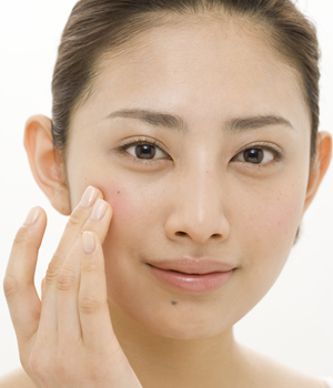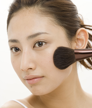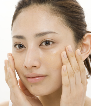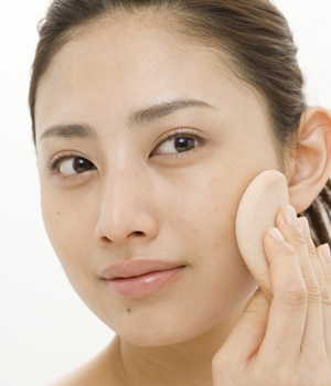 顔の内側から外側に向かってスポンジを滑らせ、ファンデーションと肌との境界線を消してなめらかに。さらに、肌の上の余分な油分をオフしてファンデーションのもちをアップ。