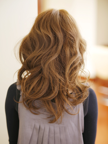 Wパーマで作るざっくりとした束感とルーズな動きがポイント。ウェーブラインをきれいに出したボリューミィなスタイルはラグジュアリーな装い。ハチ下から顔を包み込むように大きめのカールが動き、フェイスラインがうまく隠れるので小顔効果大。重みがあるスタイルなので明るめのカラーで春っぽさを出すのが重要です。