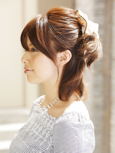 ブロッキングしてシュシュでまとめた簡単アレンジはトップとサイドの質感の出し方にポイントが。トップはふんわりとラフに見せて、サイドはタイトにまとめます。こうすることで頭の形がきれいに見えて、ワンランク上の繊細な仕上がりに。