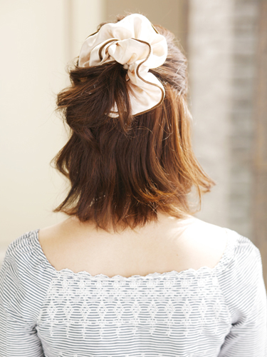 サイドをタイトにして1つに結び、トップの髪を指でつまんで軽く引っぱり出します。高さを出すことでおしゃれ感がアップ。トップがペタっとしてしまう人は逆毛を軽く立てても◎。シュシュをつけて毛先を散らして完成。