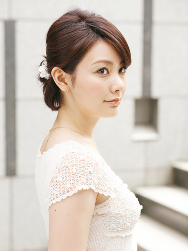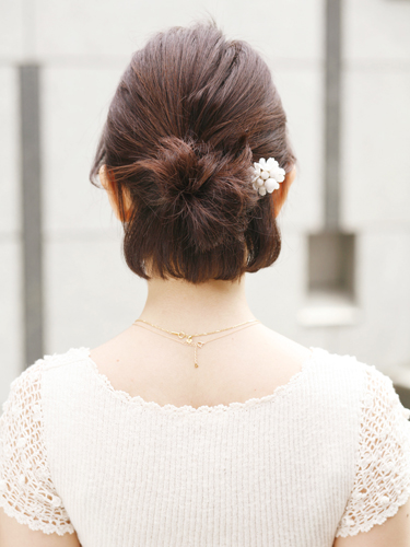 ショートやボブでハーフアップにするならトップで高さを出すのがポイント。高さが出ることで普段とは違う“よそ行き”風のアレンジに。さらに、毛先を巻いて遊ばせることで華やかさをプラス。シンプルなスタイルなのでヘアアクセをワンポイントでつけると◎。