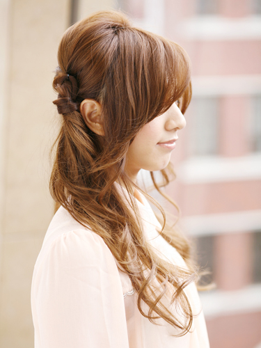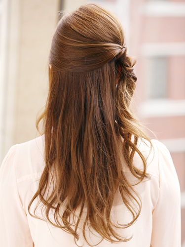 ハーフアップでハチ上をすっきりと見せることで、ウェーブの毛流れや毛先の動きが際立ち女性らしいスタイルの完成。アップにした髪を2度に分けて留めるという簡単テクがアクセントとなりも可愛さもプラス。フェイスラインの髪をアイロンでリバースに巻くと華やかに。