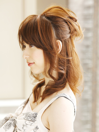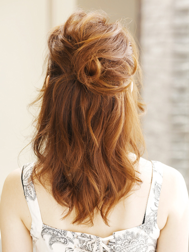トップの髪をやや少なめに取って仮留めし、中間部分の髪はねじってピンで固定します。ねじった髪をさらに上下2つに分け、下側の髪をねじって、先にまとめた部分の近くにピンで留めます。最後に残しておいた髪をふんわり下ろして、まとめた部分にかかるように留めれば完成。