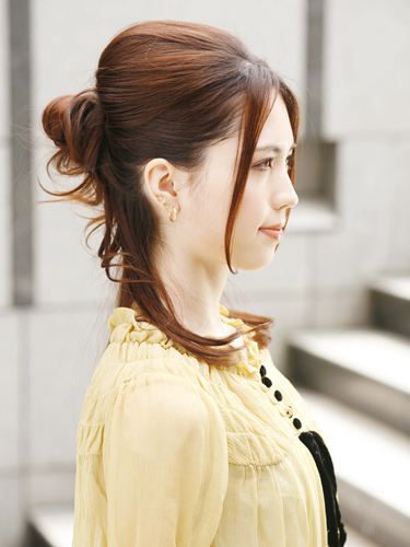 後頭部に丸みを持たせ、顔まわりをすっきりさせた上品スタイルはパーティやデートにぴったり。顔まわりのすっきり感とは対照的におだんごはゆるくまとめて大人の余裕を醸し出して。正面はシャープに、サイドはフェミニンにとさまざまな表情を見せて注目の的に。