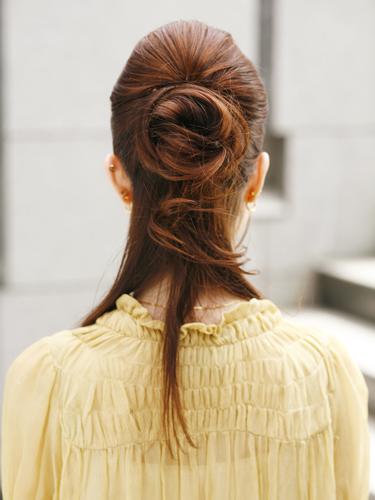 ハチ上の髪を仮留めしてから、ハチ下の髪をゴムでしばります。トップの髪を下ろしてしばった部分にかぶせてピンで固定。毛先を巻きつけておだんごをつくります。ルーズ感を出すことで、バックのフォルムの美しさを際立たせて。