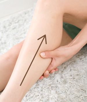 ふくらはぎの内側の肉を両手で小さくつまんで、たたみ下ろすようにマッサージ。ふくらはぎから脂肪を引き剥がすように行うと◎。内側が終わったら外側の肉も同様に行って。
