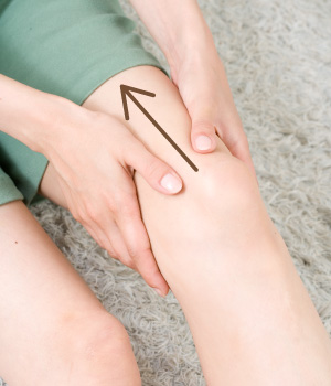 ひざの裏側か側面にあるリンパ節を親指で強めにプッシュ。リンパ節は人によって異なり、押して痛い場所がリンパ節。少しずつずらしながらリンパ節周辺をまんべんなく押して。
