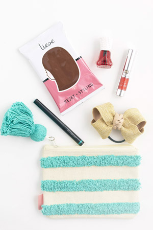ポーチ 2300円/ギャレット<リラ キャンベル>(TEL 03-3794-7770)、ラフィアリボンゴム 1000円/サンポークリエイト<アネモネ>(TEL 082-243-4070)