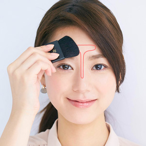 ハイライトをいれる場所は、額から鼻筋にかけてのT字のライン。額はブラシを横にすべらせるように、さっさっと1往復させれば完成。額にいれることで、立体感が生まれ、メリハリのあるシャープな顔立ちに。つけすぎると光が強く反射する場合があるので、少し控えめに。くすみがぱっと和らいで、ヘルシーで元気な印象になります。