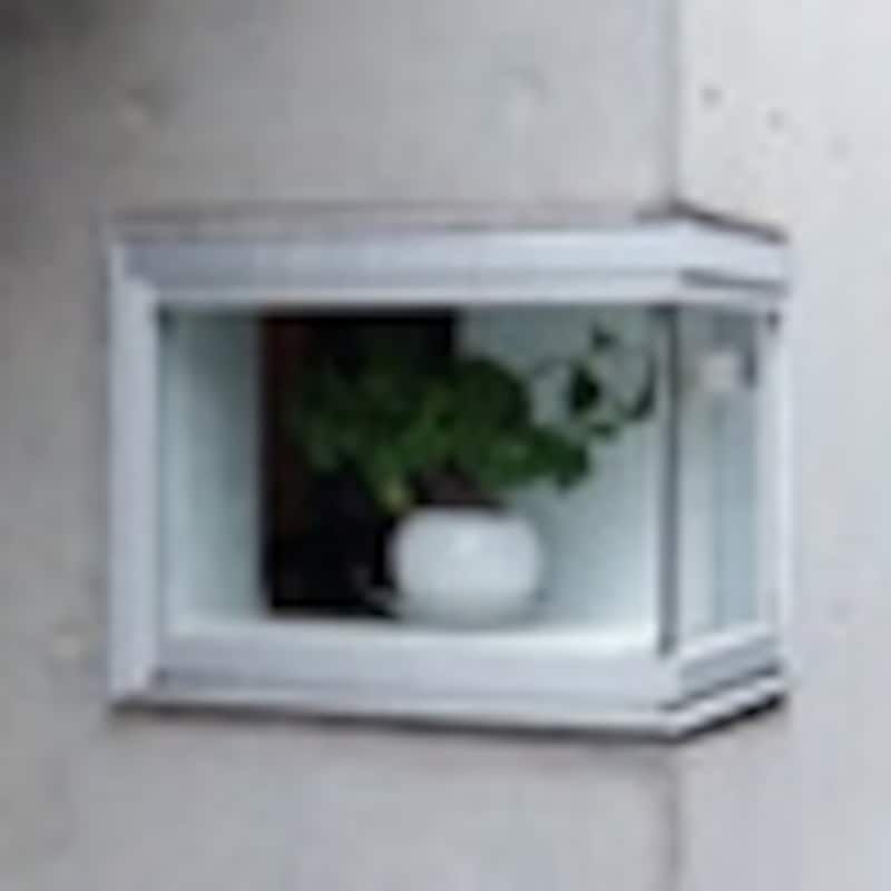 | 3. 民家のようなレトロな雰囲気の木の引戸。コンクリートの壁に付いているのはキッチンの明り取り。 |