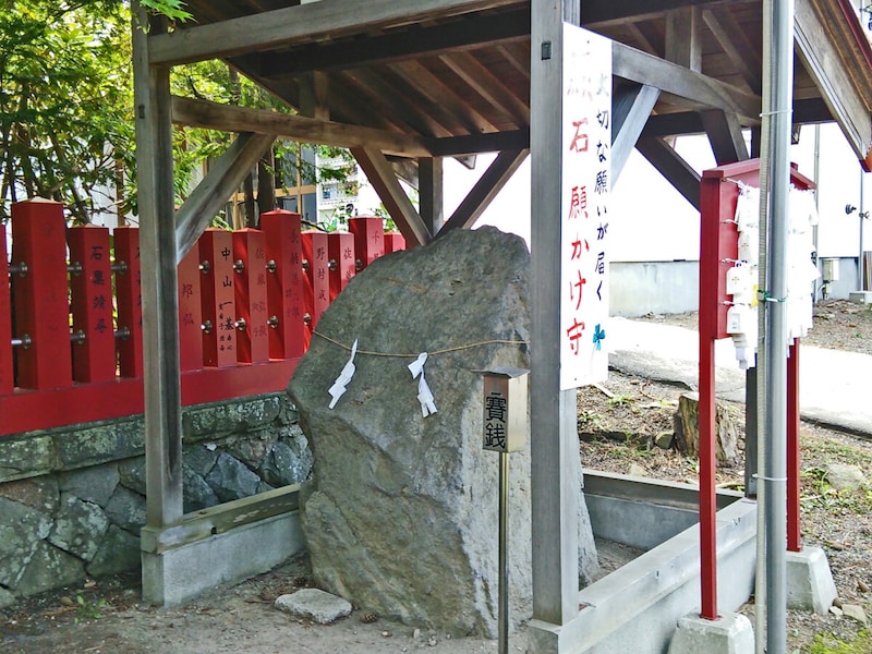 「願石(ねがいいし)」。当神社境内の地中から発見されたパワーのある大石で、自分の好きなものを一つ絶つことによって願いが叶うとのこと。願石の横にはたくさんの祈願袋が供えられています。