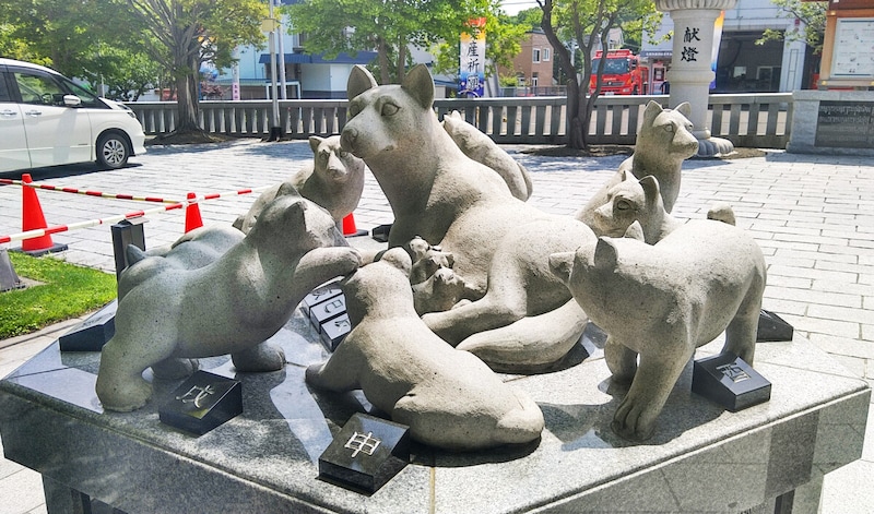 鵜茅葺不合命(うかやふきあえずのみこと)のご祭神にちなみ、本殿の左手には安産と子宝祈願をイメージした「母犬と12匹の仔犬」の碑が設置されています。それぞれの仔犬には「子」から「亥」までの十二支の文字が刻まれており、安産や子宝祈願の場合は生まれてくる子供の干支の仔犬を、また自らの健康なら自分の干支の仔犬をなでるとそのご利益が授かるとのこと。