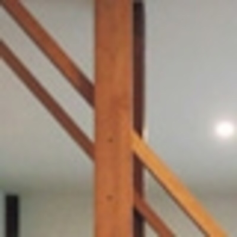 | 2. 階段は以前のアパートと同じ位置に付け、新たに手摺も取付けた。右上に吹抜けが見える。洗面ボウルの後ろに洗濯機置場とバスルームがある。 |