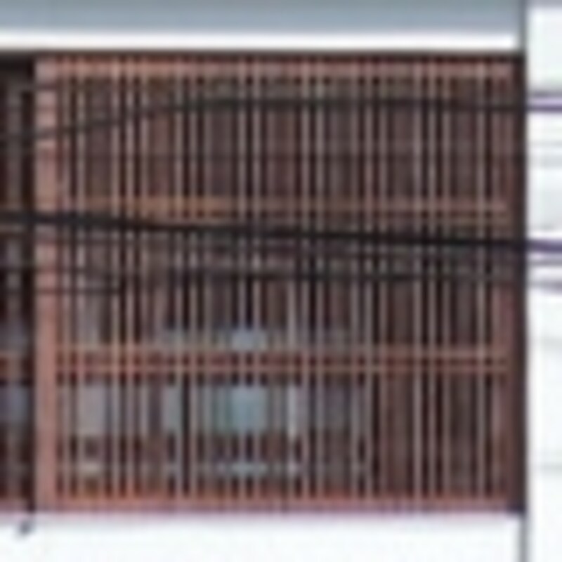 正面は車1台分のガレージスペースとなる南庭を確保するために1.5m下がり、窓の前には木の縦格子が嵌め込まれています。ここで道行く人の視線を遮りつつ、採光と通風を確保しています。茶の間から見ると、南庭と格子と縁側という3重のフィルターによって、家族のプライバシーが守られている事が分かります。