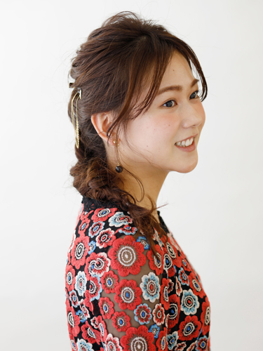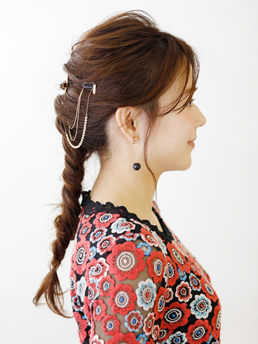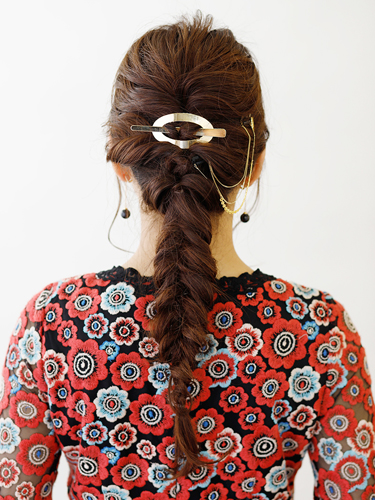 トレンドアイテムのマジェステと、繊細なゴールドチェーンが揺れるヘアアクセアリーの組み合わせは遊び心いっぱい。ヘアアレンジそのものに個性があるので、主張のあるヘアアクセを着けてもバランスがくずれません。