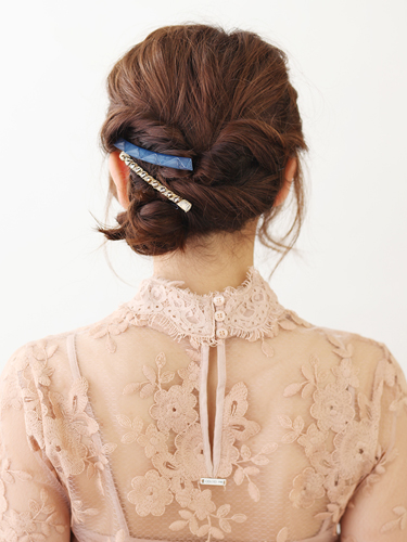 スイートな雰囲気になりやすいシニヨンアレンジに、直線的でマニッシュなヘアアクセを合わせることで大人っぽく。乳白ブルーとゴールドバレッタの2点使いで、甘過ぎない女らしさが際立ちます。