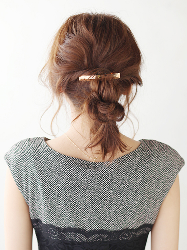 なめらかなピンクゴールドの輝きを放つシンプルなバレッタ。ゴムの結び目を隠せるサイズ感を選ぶと◎。大人っぽくきちんと感のあるデザインなので、オフィスでも活躍します。