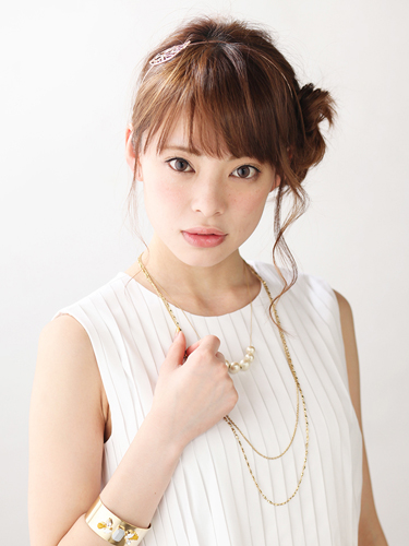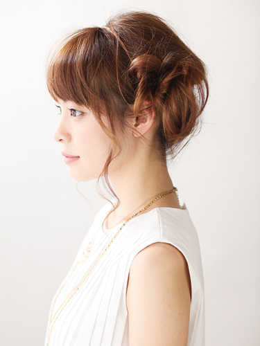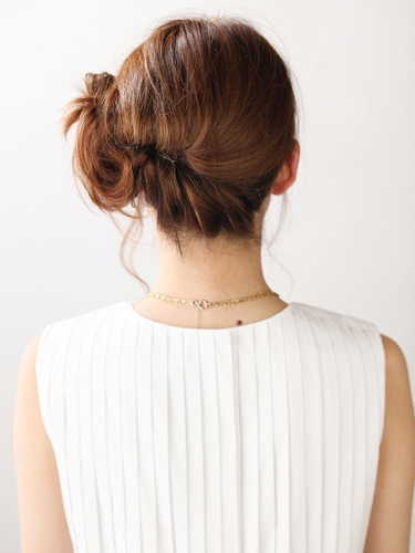 見る角度によって表情が変わるアシンメトリーアレンジは、トレンドに敏感な友人や業界人が集まるパーティにうってつけ。髪を上下に分けてから毛束をねじりあげるので、伸ばしかけの髪でもアレンジしやすい! サイドに寄せた部分のボリューム感とトップのふんわり感、潔くスッキリとした出したうなじが好バランスです。