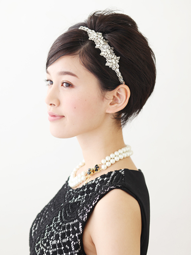 映画『ティファニーで朝食を』のオードリーヘップバーンを連想させるアレンジは、大人のプリンセスヘアと呼ぶにふさわしいスタイル。カチュームを使うことで、ショートレングスならではの色っぽさとかわいさを引き出します。トップの丸みと前髪のタイトさにメリハリをつけると、より完成度がアップ。