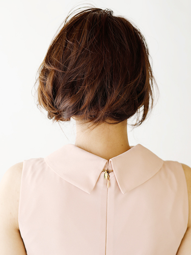 ボーイッシュなショートヘアだけど、パーティでは女性らしい印象に見せたい。そんなときは、ボブシルエットを作るのが正解です。えり足の毛をすくい上げながらねじり込み、後ろから見たとき三角形になるよう形を整えます。