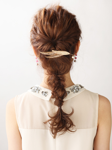 動くたびコットンパールが小さく揺れる、リーフモチーフのヘアクリップ。リーフ部分が薄く主張し過ぎません。華やかな編み込みにカジュアルなヘアアクセをつけることで、甘いだけで終わらない大人っぽい雰囲気に。