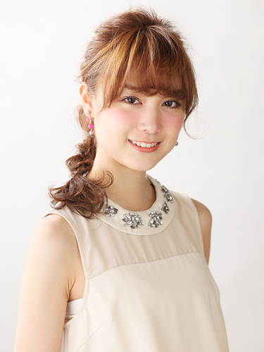 まるで『アナと雪の女王』のエルサを思わせるプリンセスアレンジ。ローウェイトのポニーテールに三つ編みを絡めた可憐なスタイルです。ふんわりと女性らしいバックスタイルに合わせ、前髪もアイロンでクセ付けをして立体的に仕上げます。毛先にもしっかりとカールを残してフェアリーに。