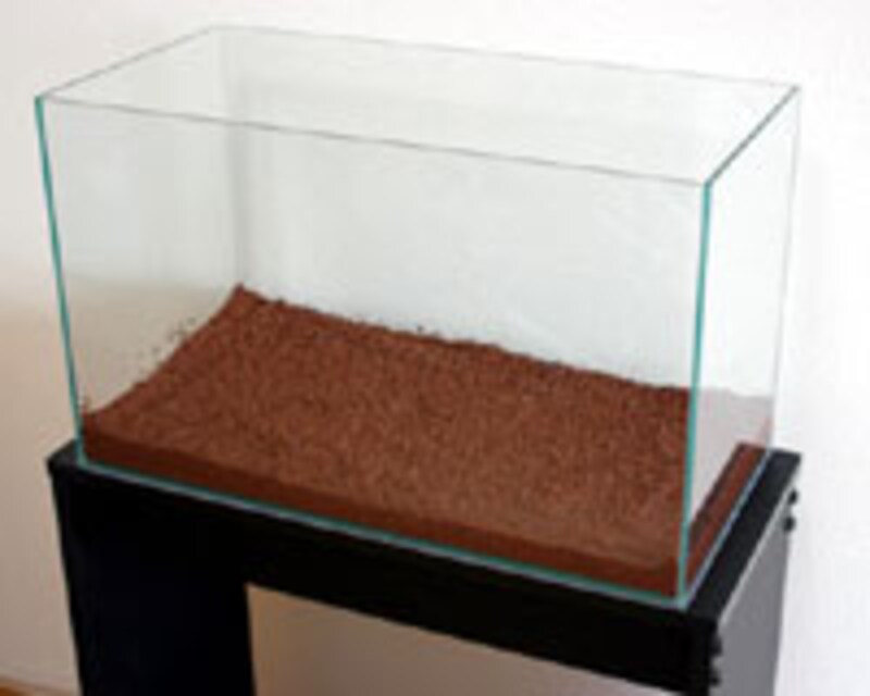 ●先程設置した台に水槽を載せ、そっと砂利を敷きます。その際、水槽の前面から高方にかけて緩やかに傾斜をつけると、水草を植えた際に映えます。