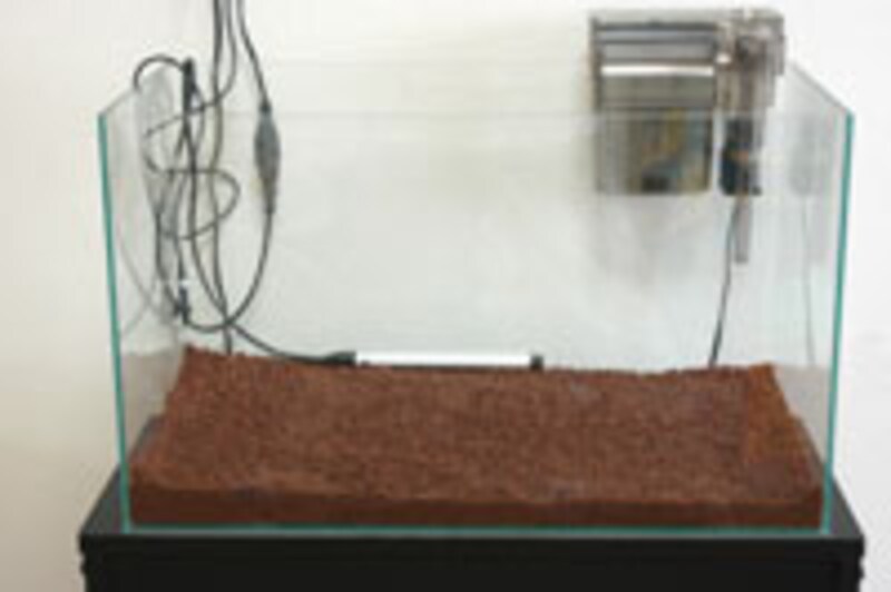 ●ヒーター、サーモスタット、ろか器をセットします。ろか器には、水の汚れを分解してくれるバクテリアの住処となるろ材が必要なので、説明書に沿ってセットしておきます。サーモスタットは、通常25℃前後に設定します。