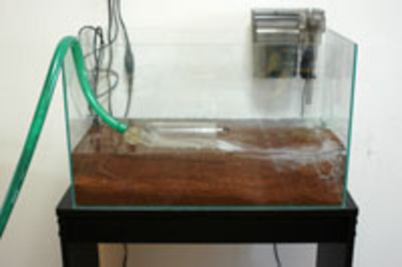 ●先程入れた砂利を舞い立たせないように、ポリタンクやバケツ、またホースが引き込めるようであればホースから直接水道水を注ぎいれます。その際、湯沸し器などを使って、水温を25℃前後に合わせておきます。