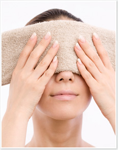 水で濡らしたタオルを1分程度電子レンジにかけ、蒸しタオルを作る。それを、目の上に置いて5分ほどそのままで。電子レンジから取り出した直後はタオルが高温になっているので要注意。