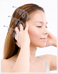 耳後ろに両手の指を置き、後頭部に向かってらせんを描くようにグルグルとマッサージ。指の腹で頭皮を動かしていることを確認しながら行って。(※コットンがはがれ落ちないようであれば、コットンパックをしながらマッサージすると◎)