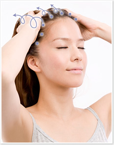 2同様、前髪の生え際に指を置き、後頭部に向かってらせんを描くようにマッサージ。頭皮を動かすことを意識し、自分が“痛気持ちいい”と感じるくらいの力加減で。