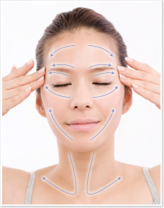 たっぷりとクリームをつけ、額の中央→こめかみ、眉上→こめかみ、眉下→こめかみ、目の下→こめかみ、頬骨→歯の噛み合わせ、フェイスライン→耳の付け根、首筋、鎖骨の順に上から下へとマッサージ。