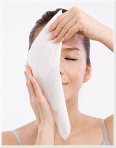 前日の食事や、睡眠不足などの影響でモデルさんの肌に“ゆるみ”を感じたときには、温冷洗顔からスタート。温冷洗顔は肌を引き締めるだけではなく、お湯とお水の交互の刺激によって血流も促すので、顔色が冴えない時やむくみを感じる時にもおすすめです。