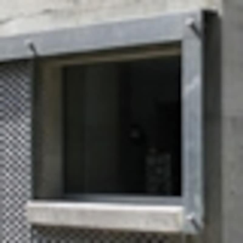4. 玄関扉は目の荒いエキスパンドメタルの吊りの引戸。玄関扉の枠と一体でデザインされたインターフォンと、枠と仕上げを揃えた金属製の郵便受け。 |