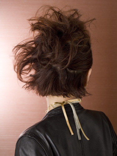 トップにポンパドールを作り、耳上の髪をそのポンパドールに向かってタイトにまとめる。まとめたトップの髪を割くように広げてモヒカンシルエットに。耳横の髪もふんわりとボリュームが出るように割いて。襟足の髪をアイロンで外巻きに仕上げれば完成。毛束を指でつまんで割くようにすると空気感がプラスされます。特にトップのふんわり感が重要です。