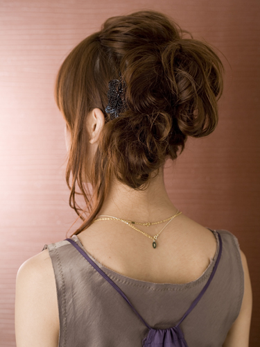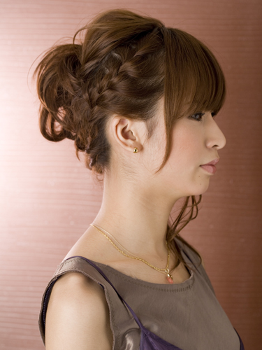 毛先全体をアイロンで巻いてベース作り。片サイドの耳上と耳後ろをそれぞれゴムでしばり、これを土台に。逆サイドから襟足に向かって編み込みを作ります。編み込みの毛先をさきほど作った土台に巻きつけてピンで固定。編み込みで崩れにくくなっているものの、ハードスプレーを軽く吹きかけておくとさらにアレンジの持ちがアップ。