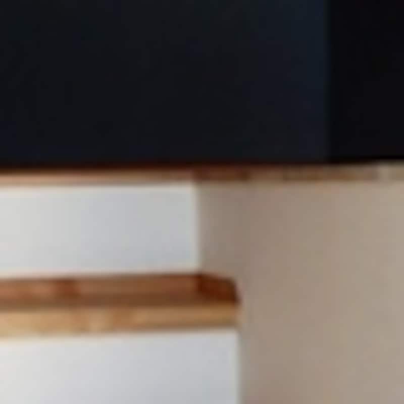 | 4. 集成材で造られた一辺30cmの格子の本棚。本棚の裏に床下収納がある。 |