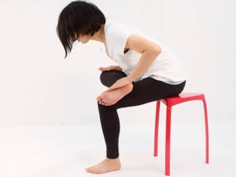 1. 椅子に浅めに腰をかけ、右足首を左脚の膝の上に乗せる