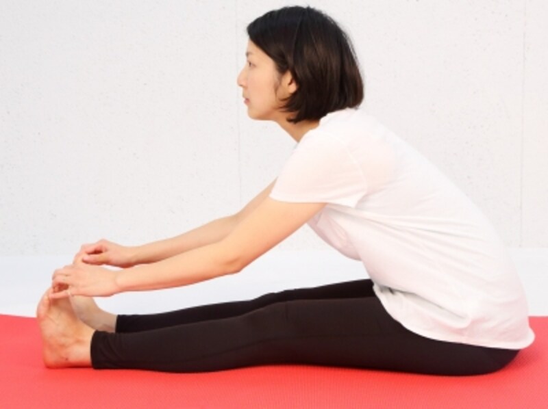 足を伸ばして座り、つま先は天井に向け、背筋を伸ばしたまま上体を倒していきます。この時、膝が曲がってしまわないように注意しましょう。