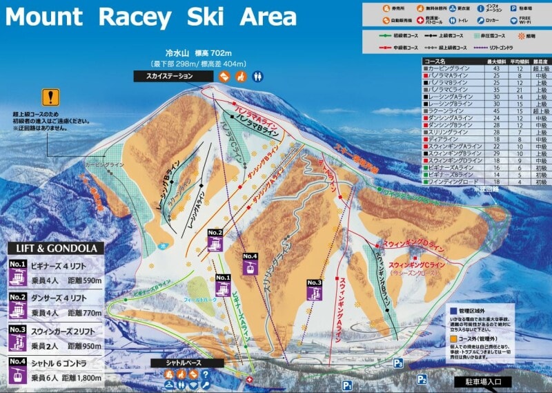 標高702メートルの冷水山の麓に広がるゲレンデはゴンドラ1本、リフト3本とコンパクトながらも、その数は17コース。3.2キロの林間クルージングを楽しめる初心者用バーンから道内最大を誇る「斜度45の非圧雪コース」というマニアックなコースまで設置されており、ビギナーから上級者までそれぞれのレベルでスキー・スノーボードが楽しめます。