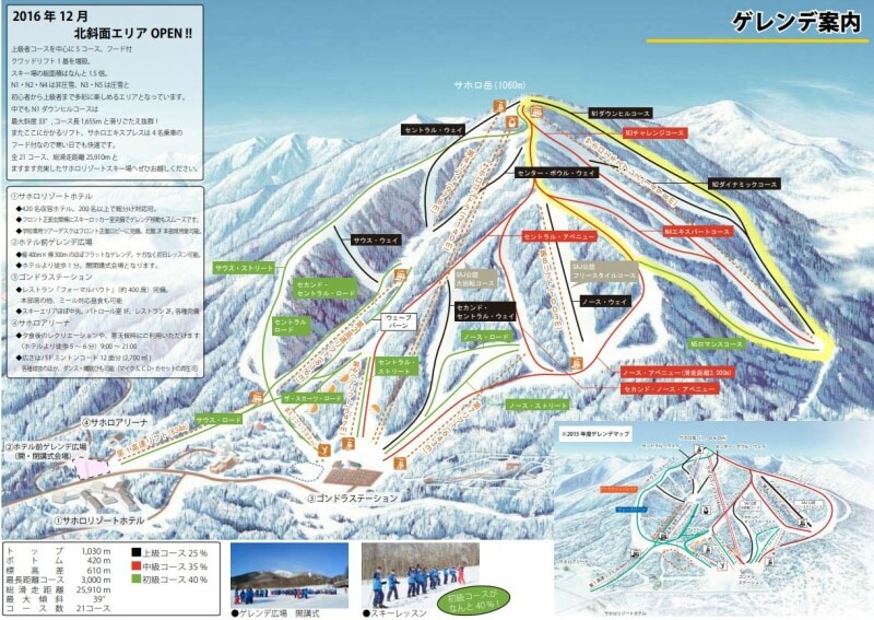 また北斜面にもフード付クワッドリフト「サホロエクスプレス」が増設され、N1からN5のパウダーマニア向け非圧雪5コースが誕生。総滑走距離24.5キロ、全21コースのビッグゲレンデとしてスケールアップしました。
