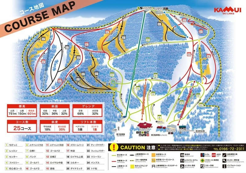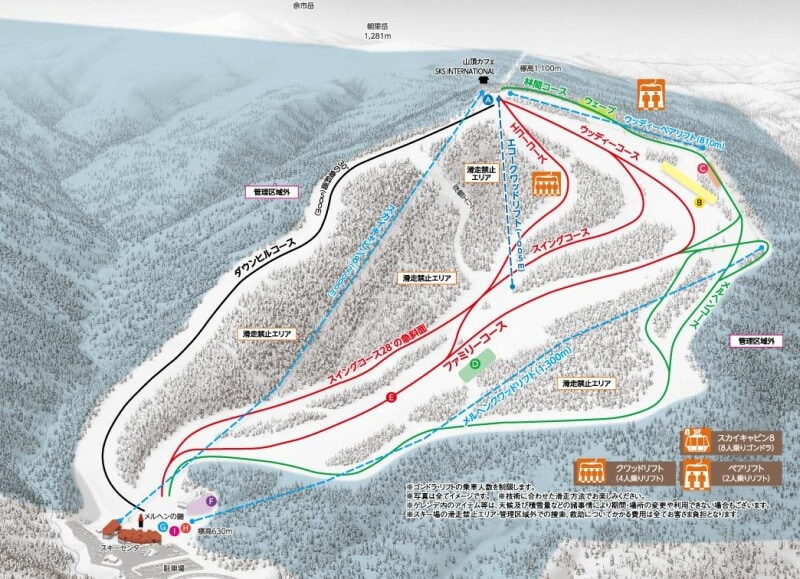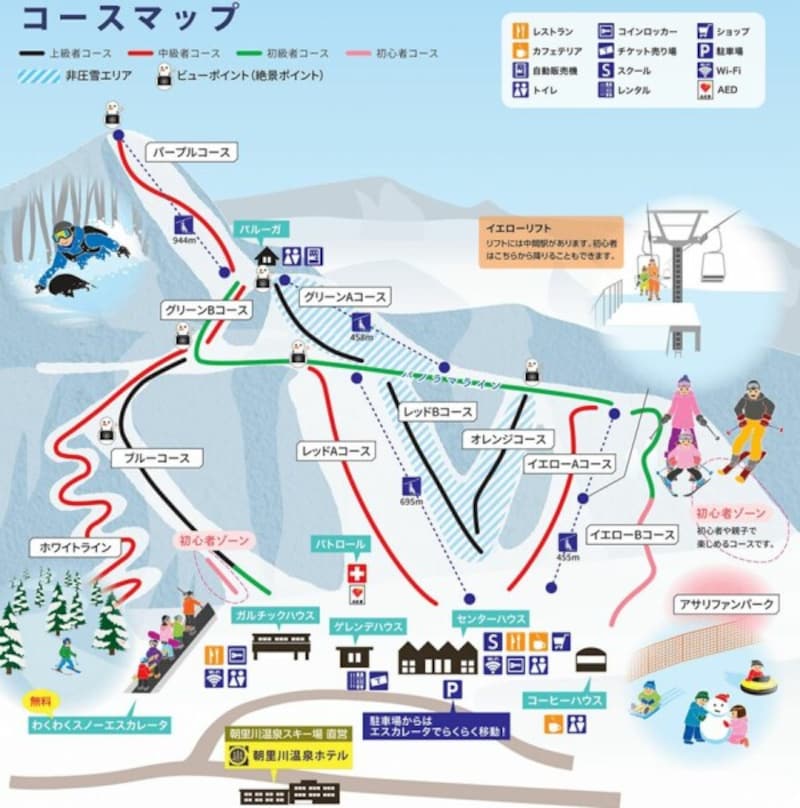 キャニオンコースを除けば斜度20度までと初級から中級レベルにあわせて設計されており、安いリフト代(1日券2500円、16:30からのナイターはなんとワンコインの500円!)ともあいまって、地元のスキーヤーでにぎわう「穴場スキー場」となっています。