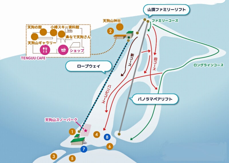 天狗の壁のようなマニアックなコースの他、小樽ロープウェイからダウンヒルする中級コース、またロープウェイよりさらに上の山頂エリアには初級のファミリーコース(平均斜度11度)もあり、休日には地元のちびっ子スキーヤーたちでにぎわいます。