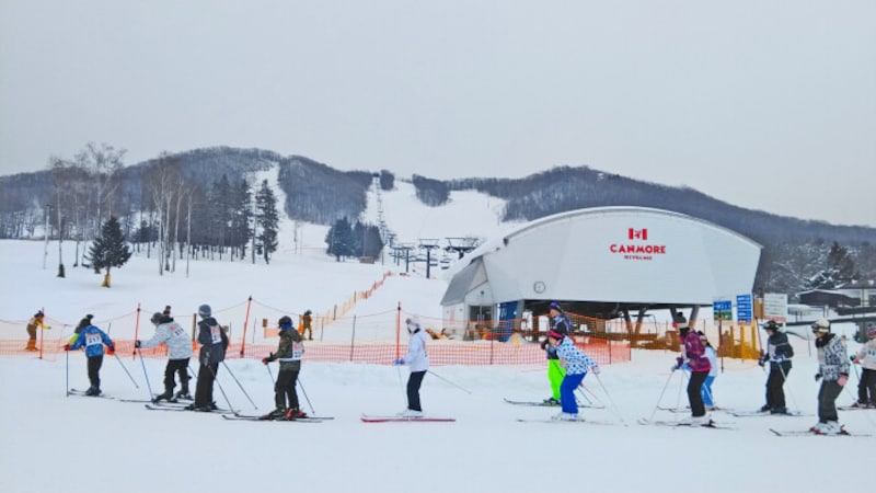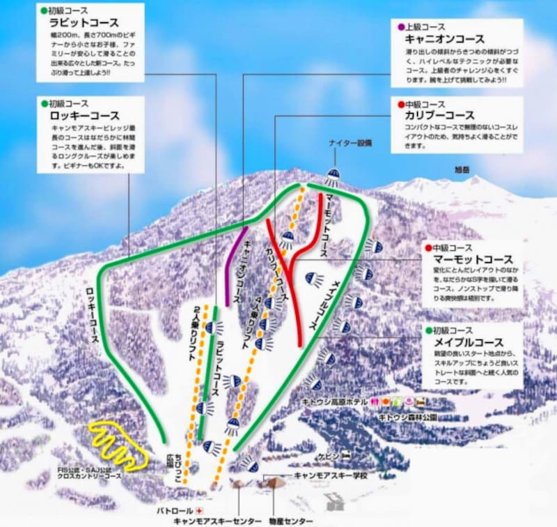 キャンモアスキービレッジ。ここはリフトの数が2本、コースは6本とややコンパクトなゲレンデですが、北海道の最高峰・旭岳に連なるロケーションにあって雪質は上々。コースは上級の