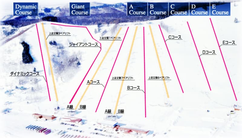 まず特筆されるのがその広さ。標高225メートルの萩の山麓には幅1.5キロという国内スキー場でも屈指の規模を誇る超ワイドなゲレンデが広がっています。エリア中心に設置された2箇所4本のペアリフト脇には初級~中級向けのA~Eの6コース(平均斜度10~15度)が、また山に向かって左手には第3リフト横に最大斜度28度の中・上級ダイナミックコースも。各コースは500~700メートルと短いものの、リフトを乗り継ぐことによってワイドなゲレンデでバリエーションある滑りを楽しむことができます。