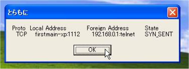 「接続状況」を選択すると2つ目の図のように接続プロトコルとコンピュータ名/IPアドレスなどが表示されます。